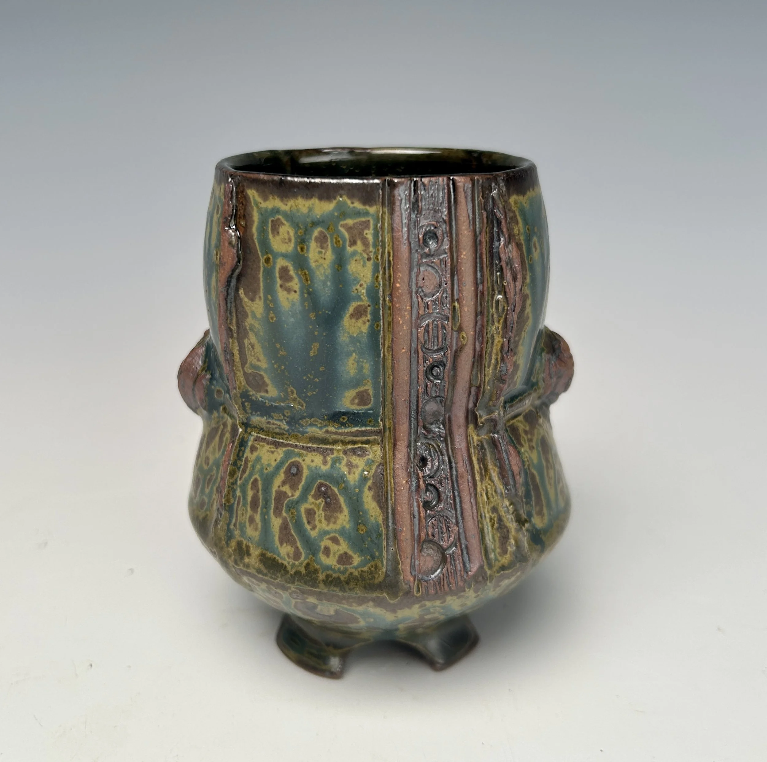 I love making mugs because they are both functional and beautiful. Each morning begins with selecting a cup for my morning coffee from my collection of handmade mugs. I hope one of my creations can become part of your daily routine. I will have 12 mugs available in my online shop, featuring a variety of colors and sizes. Each piece is carefully wheel-thrown, then sliced apart and reassembled. The texture offers an enjoyable tactile experience, with geometric designs that reflect important architectural concepts. My work is high-fired in a gas reduction kiln, making it safe for daily use in the microwave, oven, and dishwasher.
